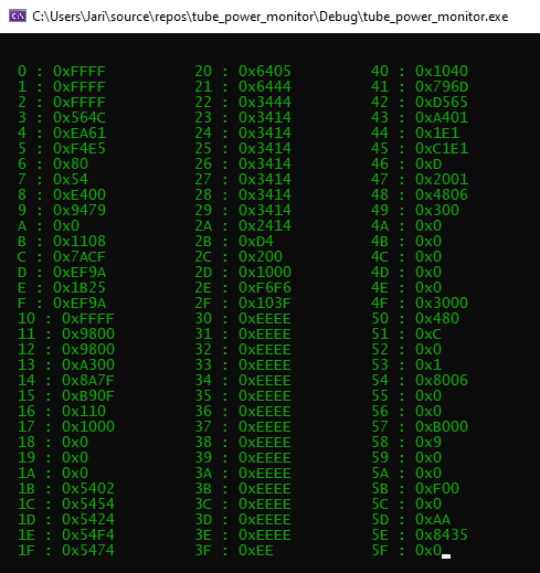 The console application prints the received octets in groups of 2, or 16 bits and prints them ordered with msb to lsb. Thus the received octets are read from right to left and up to down. Rows 0 – 2F are the ethernet frame data, 30 – 3F are the padded bytes which when “EE” indicates a correctly received frame and the last 32 registers 0x40 to 0x5F are the MDIO registers.