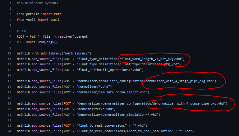 Using the ideas presented in the dependency management, all of the modules that go in the floating point are referencing packages using the “use work.package.all” notation. This leaves us with the possibility to compile the sources into any desired library. With this we can choose what packages are in the same library as with the floating point alu sources. Since we do not specify the library, we we have the possibility for adding the same sources to multiple different libraries thus the same project can have multiple different floating point units if needed. This lets us use the compile script as an interface for building a specific floating point module.