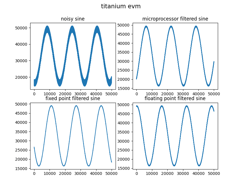 In the Efinix Titanium build in the example project, the floating point processor replaces the floating point filter architecture that was already present in the design. This allows us to have the same code for all of the builds with just varying implementations. The floating point processor also runs the same low pass filter as the directly in hardware implemented filter. Since both utilize the floating point alu, the performance is the same although the float processor has a few extra cycles of latency due to the memory being in series with the data path.