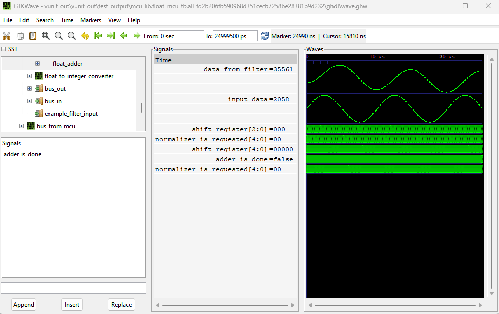 end vunit_simulation; The simulations are launched using VUnit and GHDL and the result is viewed with GTKWave. The command line for running the VUnit script is