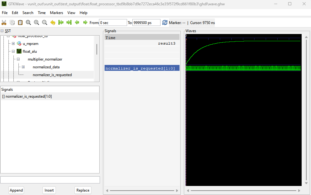 python vunit_run_sw_processor.py -p 32 --gtkwave-fmt ghw Note that VUnit does have gui option, but it is preferable to open the gtkwave separately from VUnit since this allows rerunning the simulation in the background and reloading the waveform without it changing the view.