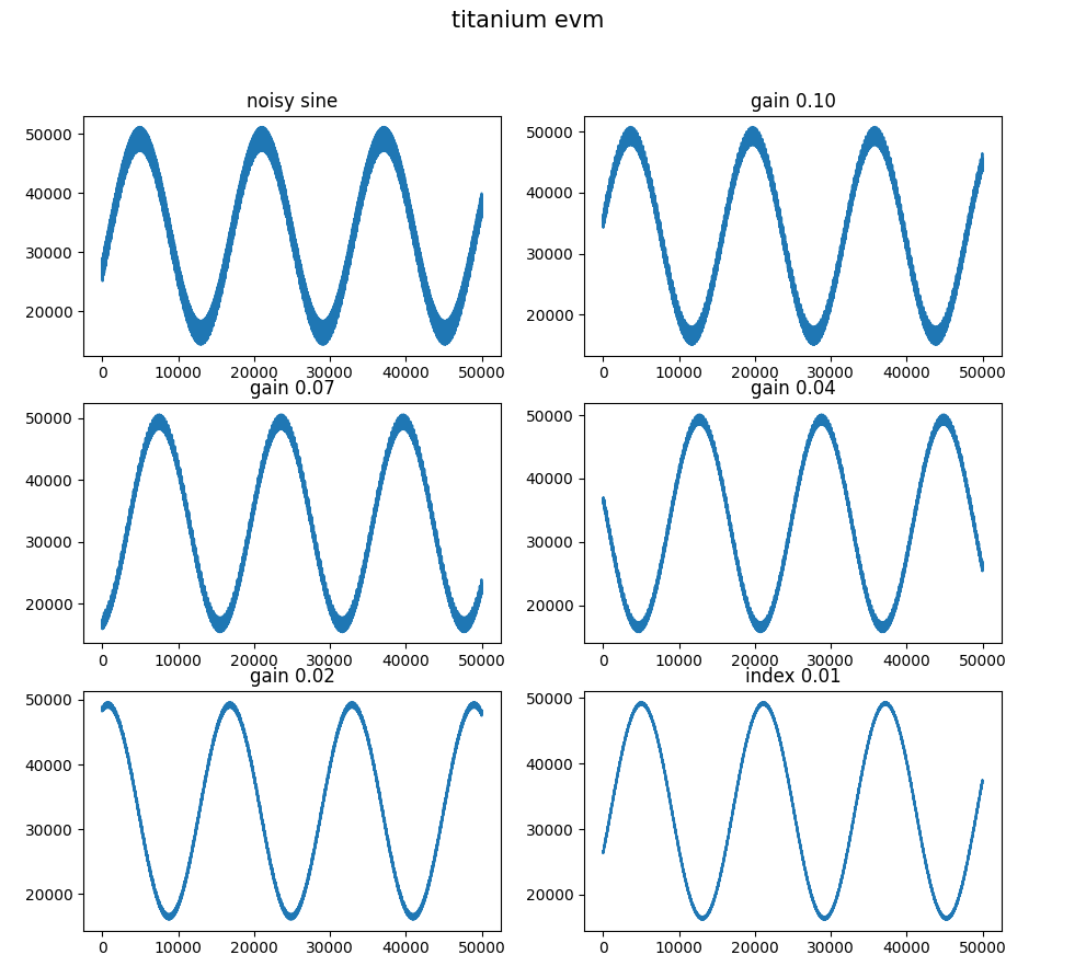 The filter results are accessed using an uart and there is a test_app.py python script through which the uart is accessed. Running the python script request 50k points of data from the unfiltered sine and then the outputs of the floating point filter from the memory processor corresponding with gains of 0.01, 0.02, 0.04, 0.07 and 0.1 which is shown in Figure 1 below.