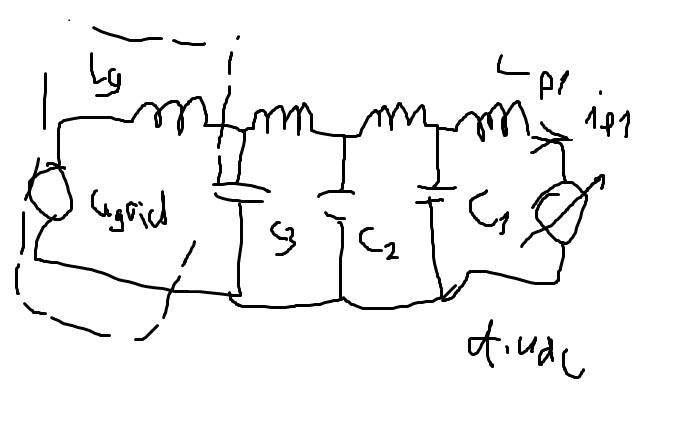 The state-space model for the inverter with a two stage EMI filter is built by connecting the EMI LC filters in series with the LC filter of the inverter. This can be done quite easily by just writing several LC filter equations and using the previous LC filters capacitor as the input voltage and succeeding filters inductor current as the load as was described in the previous blog post. The state-space model for the grid side inverter without DC link is