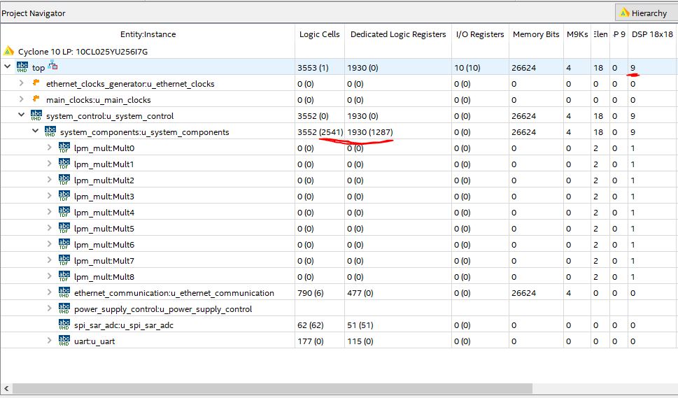 For testing purposes, the full system model is instantiated in the system components layer which takes a total of 1287 registers and slightly under 2600 logic cells, and the whole design currently can meet timing up to 130MHz for the core clock. The test code still has the all of the parts of the design developed in previous blog posts in it including bandpass filter, uart, ethernet with its small communication stack so the simulation model takes up rougly half of the entire design or approximately 1900 logic cells. This is still quite low amount of logic, as even the smallest FPGA of the cyclone 10 lp family has 6000 logic cells available and the entire design currently consuming only 14% of the total logic available in the 25k logic FPGA.
